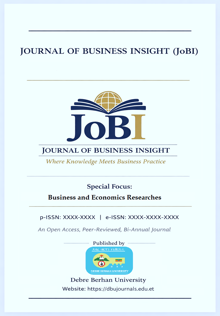 The Journal of Business Insight (JoBI) is an open-access, bi-annual academic publication journal operated by College of Business and Economics of Debre Berhan University, aimed at advancing the fields of accounting, finance, economics, hotel & tourism, logistics & supply chain, management, marketing and related disciplines. As a platform for high-quality, peer-reviewed research, the journal seeks to foster innovation, provide practical business insights, and promote knowledge exchange between academics, practitioners, and policymakers.