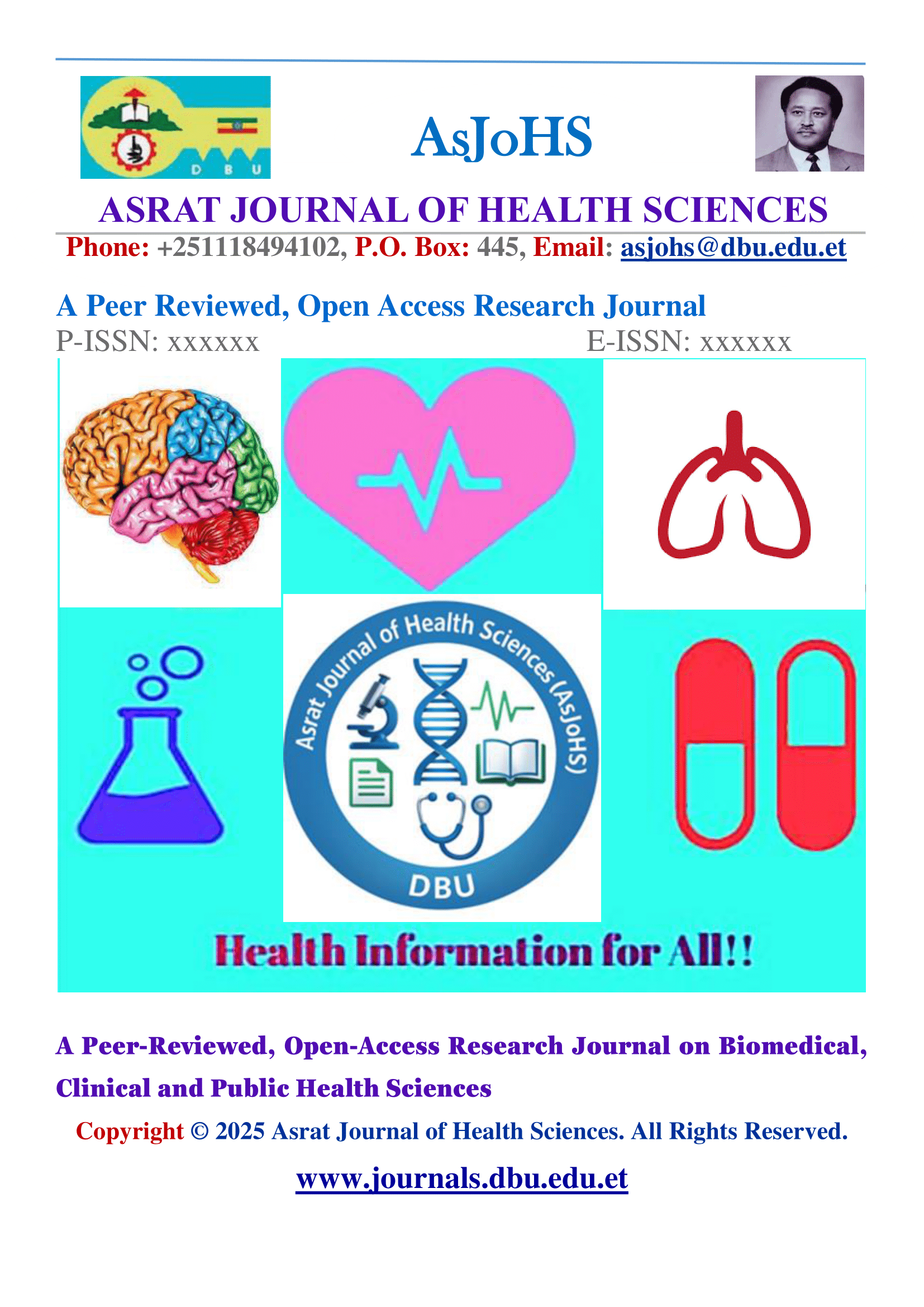 Asrat Journal of Health Sciences (AJoHS) strives to excel in health and biomedical sciences related fields through high quality, evidence based publication of research works for academicians, active researchers, scholars, scientists, managers, policymakers and students. It is expected that AJoHS papers published will give insight that adds to the knowledge of Biomedical, Clinical and Public Health. It is an open-access biannual journal which publishes peer-reviewed articles that significantly contribute to the understanding and improvement of health and the health sciences.