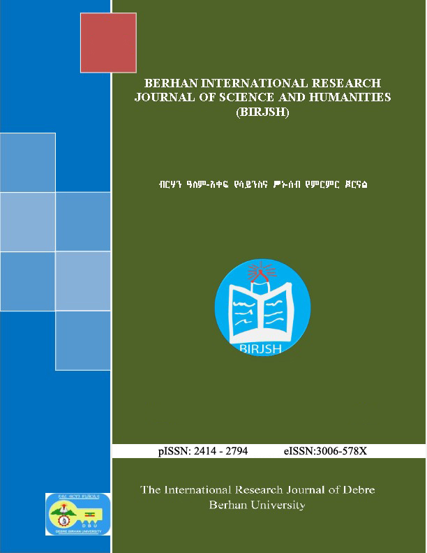 Berhan International Research Journal of Science and Humanities (BIRJSH) is a multidisciplinary open access and peer reviewed journal that is published annually in both online and print version by Debre Berhan University (DBU). BIRJSH accepts innovative research and original ideas on various fields of Science and Humanity, Management, Economics, Accounting and Finance, Education, Agriculture, Natural Science, Health, Medicine, and Engineering.